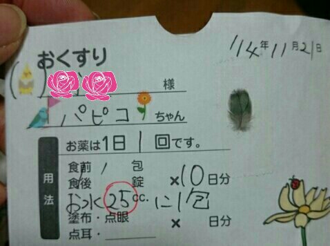 またもや治ったと思った鼻水が再発したので、病院行ってきました。 そのうを検査されてウエッと涙目になりながら先生に威嚇するその姿に涙…は出ないがこやつは気が強いなーと感心し、検査台で先生&看護婦さん達+あたしに目を三角にして威嚇するその鳴き声に先生達が興味津々。 なーんとオカメインコみたいな鳴き声と!!Σ(⊙△⊙ 看護婦さん達にオカメインコの鳴き声くずれと言われて今までの事がようやく納得。 実はパピコはペットショップにいた雛の時からオカメちゃんたちと暮らしていたのです。水槽の時はルチノーちゃんと同居、ケージデビューの時はそのルチノーちゃん、ホワイトバイトたん、ノーマルちゃん×2に囲まれてちっこいのが負けじとガッツガツご飯食べてたりハードな毛繕いをしたり、お迎えの時はピーピー鳴いてるパピコを連れて行くと察知し、オカメちゃんズが自分たちの後ろに隠したりする仲良しさ。そして初めて行った病院で治療を受けていたオカメちゃんの助けて鳴きに呼応したりだの。 あー納得~(*´˘` ) そしてスッキリ! バイリンガルパピコ。 だがサザナミちゃんと接してないのでサザナミ語が分かるか心配… 期待を裏切らない面白い奴だなぁ。 上の写真は病院でいただいたお薬袋。 いつも自分と同じ種の小鳥シールを貼っていただきますが、今回はオカメちゃんのシールがこっそり貼ってある! 芸が細かい!!! 最後にぽちっとどうぞ♪ にほんブログ村 PR |